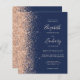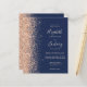 Le bord gauche de cette élégante invitation de mariage moderne présente une bordure pailletée fausse pêche. Le texte personnalisable combine une écriture manuscrite pêche pâle, des polices copperplate et italique sur un fond bleu marine. Le verso présente un design pailleté assorti de bleu marine et de pêche.