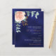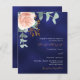 Un arrière - plan bleu marine. La couleur bleue est inégale. Décoré d'or rose et de fleurs roses rousses, de fleurs roses et de feuilles d'eucalyptus vert aquarellés, de sprigs, de verdure et d'une fausse feuille d'or. Personnalisez et ajoutez vos noms et détails. Texte blanc et doré. Retour : bleu marine arrière - plan inégal couleur. 1 feuille = 1 invite imprimé bord à bord.