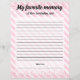 Créez des souvenirs durables avec Favorite Memory of the Birthday Girl! Dotée d'un design charmant avec des rayures roses et des accents de parties scintillant, cette feuille mémoire permet aux clients d'écrire leurs souvenirs préférés de la fille d'anniversaire. C'est une touche personnelle et chaleureuse qui ajoute chaleur et amour à toute célébration. Parfaits pour les anniversaires, les douches, et plus encore, ces draps peuvent être collectés et chéris comme un souvenir. Encouragez vos invités à partager leurs moments spéciaux et à rendre la fête d'anniversaire encore plus mémorable!