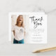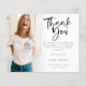 Un rapport qualité-prix BUDGET alternative sur une taille plus petite 4,5 x 5,6" semi-brillant poids 110lbs, qui est d'une épaisseur similaire à une carte postale (cependant ne convient pas à l'utilisation comme carte postale.) VEUILLEZ NOTER qu'il y a UN par feuille. Merci de graduation de script photo budget. Remerciez après votre grand parti avec ce design photo minimaliste, avec un magnifique script pour le Merci et le reste du texte est facile à personnaliser. Remplacez l'exemple de photo par le vôtre. Un calque de superposition de dégradé se trouve au-dessus de votre photo, de sorte qu'il s'évanouit lorsqu'il atteint le centre avec le texte partiellement recouvert sur le dessus.