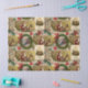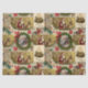 This design features a repeating Christmas pattern that looks like old-fashioned wrapping paper. It displays classic pictures of Santa Claus in his red suit standing next to a reindeer, along with large green holly wreaths tied with red ribbons that circle a snowy winter scene. The design is filled with traditional holiday details like lit candles, scrolls with greetings like "A Happy Christmas Tide," and warm colors that create a cozy and festive feeling.
