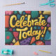 A bold and cheerful graphic featuring the hand-lettered phrase "Celebrate Today!" in a bright, textured yellow script. The text is centered on a dark, charcoal gray or black background and is surrounded by a chaotic, colorful collage of abstract geometric shapes. These shapes are painted in a tactile, stylized manner, using vibrant colors like red, pink, teal, blue, yellow, and purple. The overall aesthetic is energetic, whimsical, and celebratory.