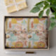 Ce design de style rétro présente de jolies illustrations d'un assortiment d'oiseaux de la jungle, de lions, de girafes, de zèbres, d'éléphants, de crocodiles, de serpents, de singes et plus encore dans les tons bleu aqua, jaune doré, orange, brun et pêche sont placés contre un arrière - plan couleur crème. Ce papier de tissu est parfait pour envelopper les cadeaux pour les jeunes enfants.