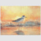 Une aquarelle éclatante illustre un oiseau debout sur une plage de sable, avec des vagues océaniques douces et des teintes de coucher de soleil brillant créant une atmosphère paisible et peinte.