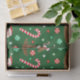 Un cadeau de vacances équestre créatif ou des tissus de fête avec Père Noël chevauchant un cheval rocking entouré de bonbons de Noël.