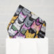 Une illustration amusante du visage des chats bordés d'un contour noir audacieux. Il y a des chats gris, noirs, orange et blancs aux oreilles pointues serrées les unes à côté des autres dans un collage sans couture, motif répétitif. Ce dessin humoristique en aquarelle est le cadeau idéal pour les amoureux de les chats qui ont adopté ou acheté un nouvel ami félin.