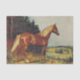 La peinture à l'huile vintage de couleur d'une châtaigne a coloré le cheval avec la queue flaxen et la crinière se tenant sur une colline avec un verger de pin et donnant sur une ferme et met en place le paysage.