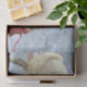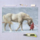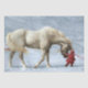 Une belle image d'un cheval blanc conduit par une fille en manteau rouge pendant une tempête de neige orne ce papier de tissu. Parfait pour vous-même ou comme cadeau.