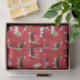 Chiens de Chaussures Basset avec manteaux brun, noir, blanc et citron habillés de tenues de vacances festives, chapeaux de Père Noël et chandails Jacquards avec des ornements de Noël éparpillés.