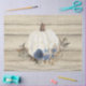 "Automne Citrouille Navy Blue Floral Script Ephemera Rustic Wood Decoupage Tissu Papier, poids lourd pour le découpage de meubles, mur art ou emballage cadeau." Il s'agit d'un plan horizontal d'un citrouille blanc avec des fleurs bleu ardoise poussiéreuses et bleu marine et des feuillages de chute de couleur terreuse sur un arrière - plan patiné peint rustique de couleur claire récupéré en planches de grange en bois qui a également écriture manuscrite éphémère et a été peint en aquarelle par l'artiste et designer de licence internationale, Audrey Jeanne Roberts, copyright.