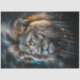 L'image montre un lion majestueux orné d'une coiffure détaillée et élaborée. La coiffeuse est décorée de perles, de plumes et d'une grande pierre bleue centrale. La crinière du lion est épaisse et volumineuse, se mêlant harmonieusement aux décorations complexes. La coiffure présente différentes couleurs, dont le bleu, le turquoise et l'or, qui ajoutent à l'aspect royal et mystique du lion. L'arrière - plan est sombre avec des touches de braises brillantes, créant une atmosphère dramatique et puissante. Cette image est intéressante et pertinente en raison de sa représentation artistique du lion, symbolisant la force, la noblesse, et un lien avec des thèmes culturels ou spirituels. Joyaux amérindiens lions majestueux, coiffure élaborée, perles et plumes, pierres précieuses bleues, crinière épaisse, royal et mystique, arrière - plan sombre, braises brillantes, atmosphère dramatique, symbolisme culturel."