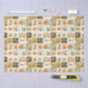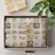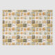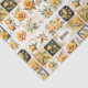 Des étiquettes noirs et blancs avec des fleurs d'or, des feuilles et du texte créent un beau collage d'objets sur le thème de Noël sur ce papier de tissu.
