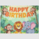 Cute Happy Birthday safari theme with monkeys, lion and elephant in the jungle.