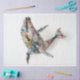 Une sculpture unique d'un dauphin recouvert de graffitis colorés. Le graffiti présente différents mots, symboles et dessins abstraits dans de multiples couleurs vives. Cette oeuvre se distingue par la combinaison de la forme naturelle d'un dauphin avec le style artistique urbain du graffiti, créant une pièce visuellement frappante et éclectique.