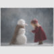 Child building snowman winter scene, red coat matching hat snow, carrot nose brown scarf snowman, gentle snowfall outdoor play moment, whimsical seasonal childhood illustration print, festive snowy day creative art, rustic snowman forest winter charm, joyful snow interaction holiday image, nostalgic winter storytelling kids artwork, cozy snow-covered ground vintage style.