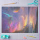 L'image représente un paysage fantastique et surréaliste. Il présente un ciel plein de vie et coloré, avec des teintes de violet, de rose et d'orange, suggérant soit un lever de soleil, soit un coucher de soleil. Il y a deux grands corps célestes visibles dans le ciel, l'un ressemblant à une planète avec une surface multicolore et l'autre une comète ou un météore avec une queue brillante. Le paysage comprend un plan d'eau calme reflétant les couleurs vives du ciel, et des falaises rocheuses déchiquetées sur le côté gauche. Plusieurs créatures ressemblant à des dragons volent dans le ciel, ajoutant à la nature fantastique de la scène. La composition globale est onirique et surréaliste, ce qui la rend intéressante et pertinente pour ses éléments imaginatifs et visuels saisissants. paysage fantastique, paysage surréel, ciel coloré vibrant, teintes du lever ou du coucher du soleil, corps célestes dans le ciel, planète multicolore, comète avec la queue brillante, corps calme de l'eau, falaises rocheuses, créatures volantes comme des dragons, scène mondaine paysage visuellement saisissant, RHDesigns par 2chattychicks.