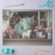 scène lunaire, vache de montagne, vache de bébé, fourrure turquoise, fleurs roses, fenêtre rustique, aménagement floral, décor charmant, style vintage, atmosphère cosy, unique photo d'animal, photographie artistique L'image représente une scène fantasque et charmante avec une vache de montagne à fourrure turquoise et de grandes cornes, debout derrière une fenêtre rustique. Devant la vache se trouve une petite vache moelleuse à fourrure blanche. La fenêtre est ornée d'un ensemble de fleurs roses et blanches dans différents vases et récipients, créant une atmosphère cosy et vintage. Les arrangements floraux et la fourrure turquoise unique de la vache rendent la photo particulièrement intéressante et visuellement attrayante.