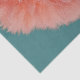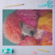 L'image présente un gros plan d'un caniche teint en fourrure dans des couleurs vives de rose, orange et jaune. Le caniche a des cils noirs proéminents, donnant l'apparence de porter du maquillage. L’arrière - plan est d’une couleur turquoise, qui contraste avec les couleurs vives de la fourrure du caniche. Cette image se distingue par le toilettage insolite et artistique du chien, en faisant un exemple frappant de mode animal de compagnie créative.