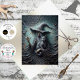 Skeleton witch art, gothic fantasy illustration, black cat and witch, bone cloak sorceress, eerie Halloween decor, teal cracked background, bats and skeletal figure, dark enchanted forest, surreal witch image, mystical undead character