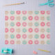 Ce mignon beigne et arroser le design motif sports plusieurs saveurs différentes. Il y a de la glace rose avec des tourbillons, du glaçage bleu et rose avec des arroses, et même de la puce chocolat vanille. Tout sur un arrière - plan de couleur avoine pour équilibrer tout ce doux. Yum !