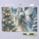 Papier de Noël. Illustration d'une fée ou d'un ange décorant un sapin de Noël dans une forêt enchantée.
