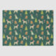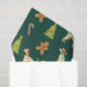 un papier de tissu sur le thème de Noël avec un motif répétitif. Le motif est constitué de plusieurs éléments, dont des whippets portant des chapeaux de Père Noël rouges et des foulards rouges, des arbres de Noël verts décorés d'ornements rouges, des hommes en pain d'épice et des sucres de canne. La couleur arrière - plan du papier tissulaire est vert foncé, ce qui contraste agréablement avec les éléments colorés. Le design est festif et fantaisiste, ce qui le rend approprié pour envelopper les cadeaux de Noël, surtout pour les amoureux de les chiens ou ceux qui apprécient un thème de vacances ludique.