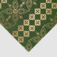 Rangées de motifs floraux abstraits reproduisant l'or flanqués de petits losanges reproduisant la même couleur or et le tout sur un arrière - plan vert profond. Parfait pour le découpage, l'artisanat ou l'emballage de cadeaux. Assurez-vous de retirer le sac cadeau correspondant!