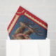 Happy Santa Claus holding an ivy branch sitting in his pink and gold sleigh and reindeers taking off to deliver toys tissue paper.