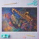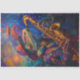 Dans une fusion de couleurs et de sons, "Jazz Scales" capture Lenny le Lizard au milieu d'un solo à corne. Habillé pour impressionner avec sa cravate casquette et arc, les doigts de Lenny dansent sur les touches du saxophone sur un fond de violets, de verts et de jaunes abstraits. Les motifs tourbillonnants et les points cosmiques créent une scène autrement mondaine où la musique de Lenny transcende l’ordinaire, invitant les auditeurs à une expérience de jazz psychédélique comme aucun autre