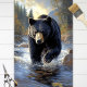 Cette illustration détaillée présente un ours noir debout dans une rivière, son cadre solide entouré d'eau courante et d'éléments naturels. Le contraste entre la silhouette foncée de l’ours et la douce rivière évoque la beauté brute et la tranquillité du désert.