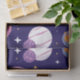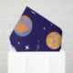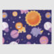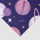 une motif sur le thème de l'espace. Ce motif présente une variété d'objets célestes et d'animaux. Il existe des planètes de tailles et de couleurs différentes, comme le violet, l'orange et le jaune, ainsi qu'un soleil éclatant. En outre, il y a des animaux animés, dont un éléphant rose, un lion jaune et un hippopotame violet, flottant au milieu des corps célestes. L'arrière - plan est un noir profond, accentuant les couleurs vives des planètes et des animaux.