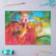 Coloré, fantaisiste et vibrant caractère de mascarade vénitienne. Belle femme blonde sophistiquée est assise avec une rose rouge et un masque à plumes à la main avec des tissus fuchsia or brillant d'un costume de boule masqué baroque avec des plumes et un chien. Aquarelle peinture aux couleurs vives en, bleu jaune rose, vert, or étincelant et argent feuille, inspirée des personnages de Comédie de l'Art ( Commedia dell'Arte ) , Carnaval de Venise et masques de plumes vénitienne.Ce design cool et artistique est aussi magnifique pour les occasions spéciales, anniversaires, fêtes, Saint Valentin, Mardi Gras ( Mardi gras ) saison