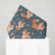 Tissu papier avec un motif fait de renards orange mignons et heureux. Arrière - plan vert foncé. Petits champignons et feuilles parsemés.