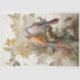 Deux oiseaux colorés entourés d'un feuillage complexe et d'autres petits oiseaux, avec un papillon planant au-dessus. Ce sont des oiseaux magnifiquement détaillés avec de longues plumes de queue, l'un est orange et l'autre est gris avec des touches de bleu. Ils sont perchés sur une souche d'arbre texturée au milieu d'une végétation détaillée. Trois petits oiseaux bruns sont également présents dans la partie inférieure de l'image. Le feuillage arrière - plan est conçu avec des nuances de feuilles verts et bruns, dont certains sont en décomposition. Il y a une qualité éthérée à l’éclairage qui donne à l’image une atmosphère sereine et magique
