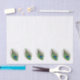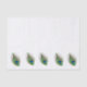 A white tissue paper with five vibrant peacock feather eyes that forme a border along one side.