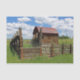 Une minuscule grange au toit rouge, seule dans un grand champ d'herbe, est partiellement fermée par une clôture de piquetage