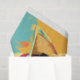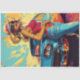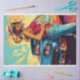 Illustration stylisée d'une personne debout à côté d'une voiture classique. La personne porte un casquette à large bord, un dessus rouge et un jean en denim. La voiture a des ailettes et des phares ronds proéminents, ce qui témoigne de la conception automobile américaine vintage. L'arrière - plan présente des éclaboussures abstraites de couleurs jaune, bleu et rouge, ajoutant une touche vibrante et artistique à la scène