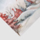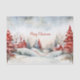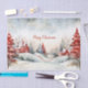 Il s'agit de la première de trois feuilles similaires de papier de tissu qui ont des photos d'aquarelle vintages de maisons de campagne rustiques dans un cadre de pins rouges et verts et de l'ornement et des couleurs colorées de Noël. Les collines enneigées sont charmantes sous un ciel d'hiver nocturne. L'écriture rouge "Joyeux Noël" salutation peut être changée en un autre texte de votre choix.