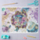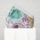 Papier de découpage de style victorien turquoise et violet rempli de papillons, plumes de paon et un paon élégant et fantaisiste. Des touches d'or, des chèques, des damas et des fleurs.