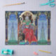 Coloré, vibrant, peinture contemporaine en or, bleu, rouge, vert, couleurs marron. Un mystérieux sorcier hypnotique avec d'élégants costumes de velours rouge tenant une sphère magique assise sur un trône gothique avec des gargouilles et une chouette. Ambient est surréaliste, fantastique, alchimique où vous voyez un bouchon boire d'une tasse, un moine tempéré volant sur une grenouille, bulles transparentes, paysages d'imaginaire avec feu d'enfer, ciel bleu cosmique avec étoiles, montagnes du ciel, arbres.Egg Tempera sur panneau en bois avec feuille d'or. 1989, Miniature Fabriquée avec des techniques picturales de 1300 par Alessandro Lumini (c) C'est aussi un beau design d'imaginaire pour Noël, Fête, Anniversaire, Jour de la Saint-Sylvestre, Mardi Gras et salutations carnavales.