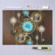 Turquoise lenses with antique watch with brass gears and golden keys on rusty, brown background. Steampunk style.