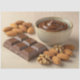 A bar of chocolate, a bowl of sweet chocolate paste and a few raw nuts on a delicate beige background decoupage tissue paper..