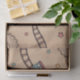 Papier de tissu illustrant l'illustration d'un train en bois souriant tapoté le long d'une voie sinueuse. L'arrière - plan est un beige à la texture délicate, chaleureuse et dégradé, avec des détails subtils comme des lances en bois et des étoiles dessinées à la main. Une option de charme pour envelopper un cadeau à un enfant !
