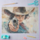 L'image est une photo peinte représentant une femme shérif pointant une arme sur un voleur de banque. Le shérif est habillé de vêtements occidentaux traditionnels, dont un casquette à large bord, un manteau long, un gilet et une ceinture avec un holster. Sa position est confiante et affirmée, avec un regard déterminé sur son visage. L'arrière - plan dispose d'un paysage sauvage et désertique avec des montagnes et un ciel nuageux, ajoutant à l'atmosphère dramatique et intense de la scène. L'utilisation de touches audacieuses et de couleurs vives améliore l'impact global de l'image, ce qui la rend à la fois frappante et évocatrice. Shérif femme photo peint, braqueur de pistolets, vêtements occidentaux, casquette à large bord, manteau long, paysage désertique accidenté, dramatique et intense, coups de pinceau audacieux, couleurs vives