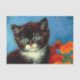 Tissu avec un beau chat en smoking Van Gogh ! Ce petit chaton pose à côté d'un panier de fleurs orange sur une table rouge. Un grand cadeau pour les amoureux de les chats et les collectionneurs d'art hollandais !