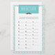 Le jeu Baby ABCs est une activité amusante pour n'importe quel Baby shower, car les invités essaient de remplir les cartes avec des articles bébé qui commencent par chaque lettre de l'alphabet. Dans un jeu de couleurs gris et turquoise, cette carte présente une illustration de moustache. L'ajout parfait à un Baby shower à thème "Little Man" ! Trouver d'autres jeux et objets correspondants sur www.zazzle.com/mypartydesign