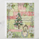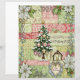 This design features a beautiful background of horizontal patchwork stripes in soft pinks, reds, and sage greens, with patterns like florals, damask, and plaid. The paper is centered around a lush, snow-dusted Christmas tree adorned with vintage-style ornaments and gold stars.