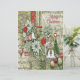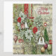 The design is built on a stunning collage of rich reds and varied greens, combining patchwork squares on the left with vintage sheet music on the right. The center features an abundant arrangement of red and creamy white poinsettias, snow-dusted foliage, and delicate white swirls.