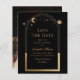 Celestial Black Save The Date Anniversaire Quinceanera Invitation présente un cadre doré, lune et étoiles sur un arrière - plan noir. À l'intérieur est votre Quinceanera personnalisée enregistrer les informations de date et au verso ajouter votre photo préférée. Personnalisez en modifiant le texte dans les zones de texte. Conçu pour vous par ©2024 Evco Studio www.zazzle.com/store/evcostudio