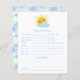 Demandez à vos invités de baby shower de remplir cette mignonne carte de prédictions et de conseils pour bébé qui présente une jolie illustration dessinée à la main d'un soleil jaune souriant qui sort de derrière un nuage moelleux. Cette adorable carte de conseil thématique "vous êtes mon soleil" fait pour un gardien merveilleux et est une activité amusante pour votre baby shower à thème soleil! L'arrière de cette carte comporte un motif de nuage abstrait peint à la main en bleu et blanc, doux et capricieux.